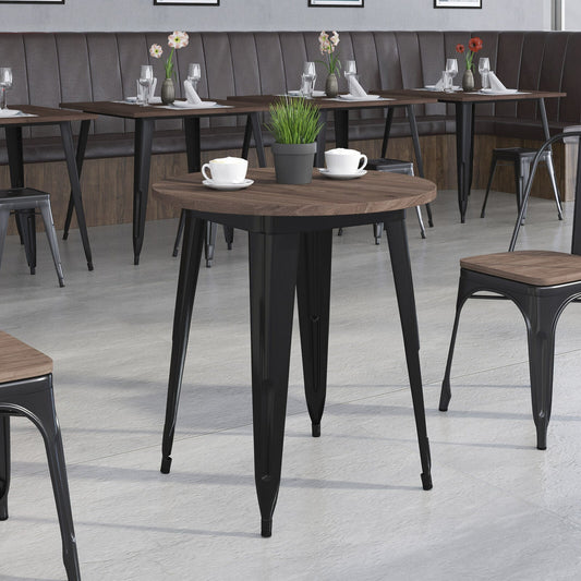 30" Round Black Metal Indoor Table with Walnut Wood Top - Restaurant Furniture