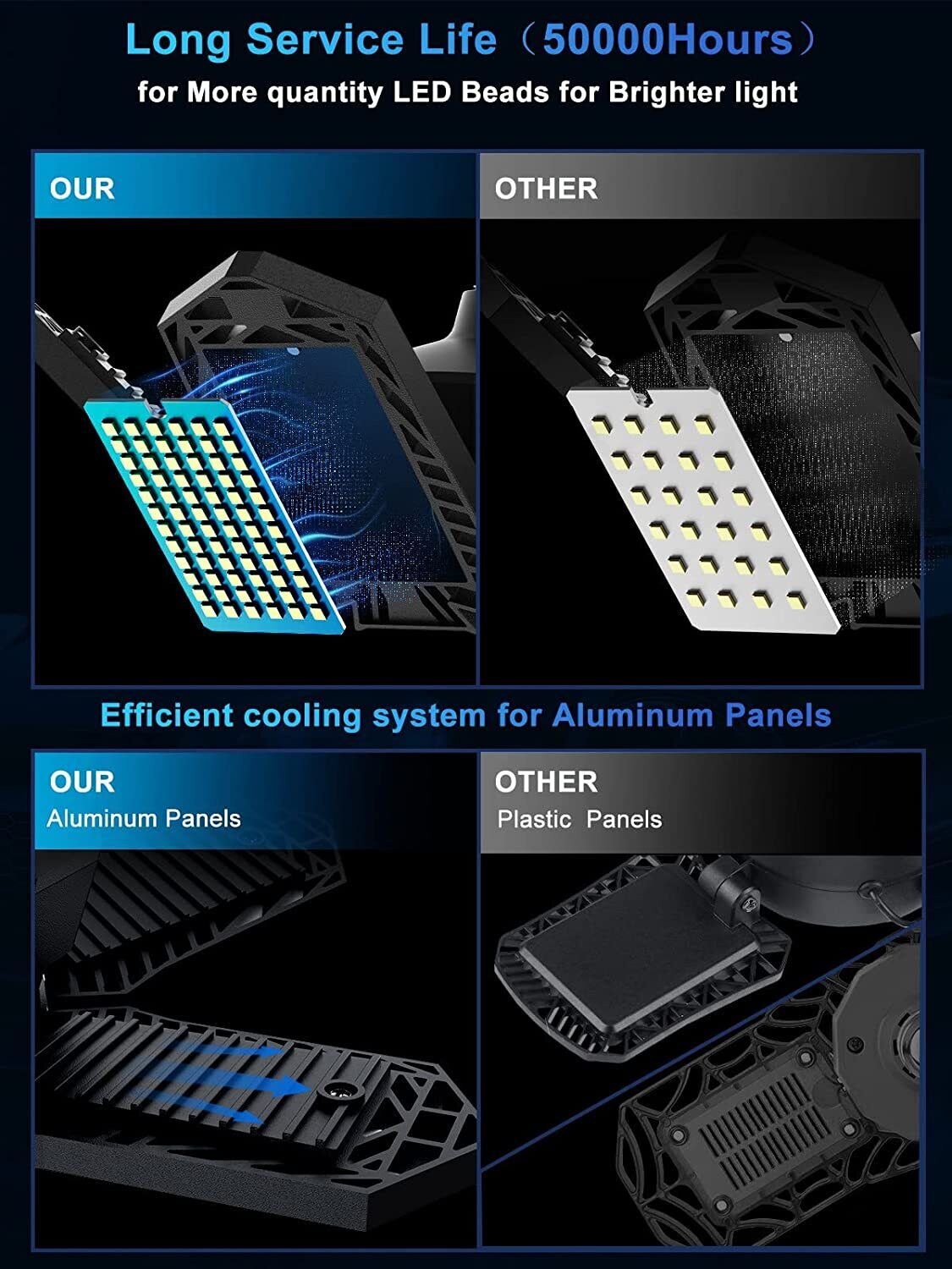 These LED Garage Lights offer a super bright lighting solution, featuring 100W LEDs with 456 high-quality lamp beads. These ceiling lights provide an impressive 10000 lumens, CRI80+, and 6500K of natural light, significantly brighter than standard lamps. They feature a unique, deformable design with six adjustable aluminum panels and a central downward panel, which can be folded up to 90°, allowing for customizable lighting and 360° coverage. Constructed with high-end die-cast aluminum, the panels ensure efficient heat dissipation and high-temperature resistance, extending the light's lifespan to 50,000 hours. These lights are also designed with safety in mind, featuring overvoltage and overcurrent protection on the circuit board. Ideal for a variety of settings including garages, laundry rooms, supermarkets, attics, workshops, and barns, they are easy to install with a simple screw-in mechanism for E26/E27 bases, requiring no additional tools or professional installation.